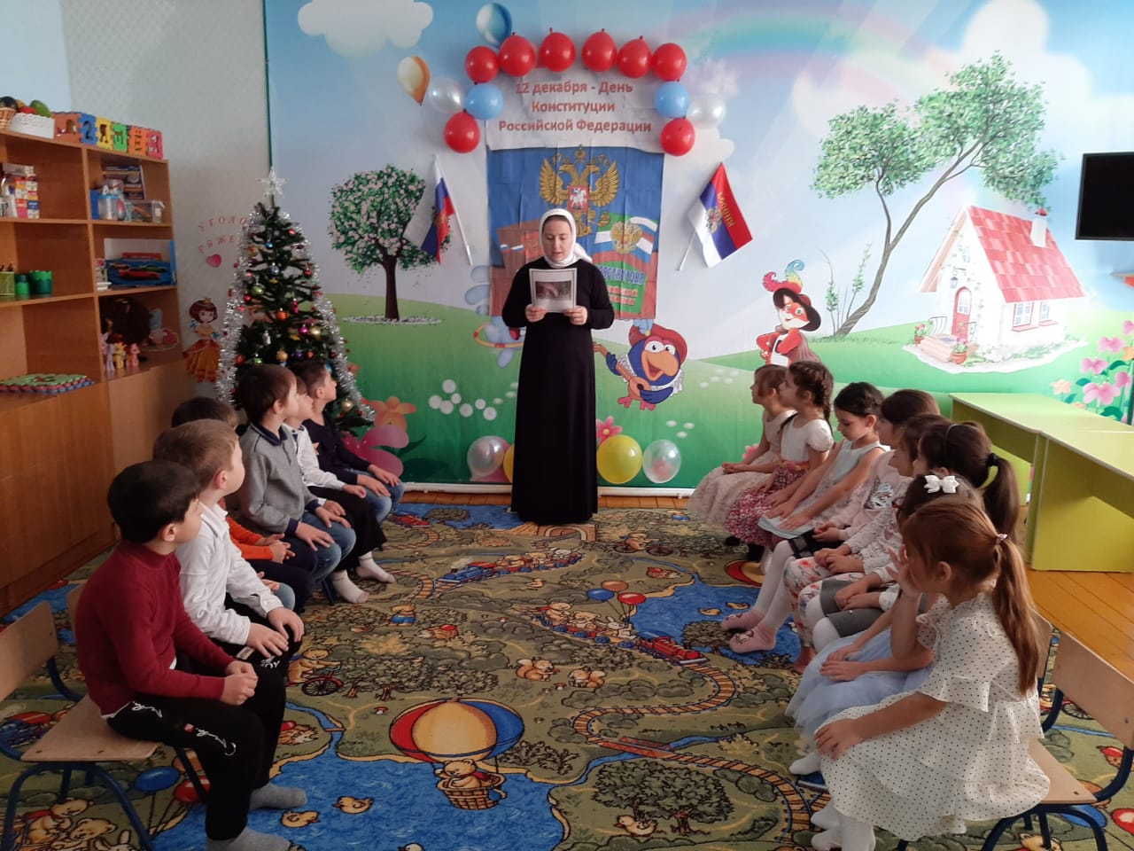 Во всех возрастных группах провели беседы об истории возникновения Конституции РФ с целью формирования представления о том, что Конституция РФ является основным законом государства, который необходимо соблюдать, познакомить детей с некоторыми правами обязанностями людей, развивать познавательный интерес к своей стране, ее законам. Воспитывать стремление знать и соблюдать законы Российской Федерации. Активизировать знания детей о своей Родине, ее символике и гимне.