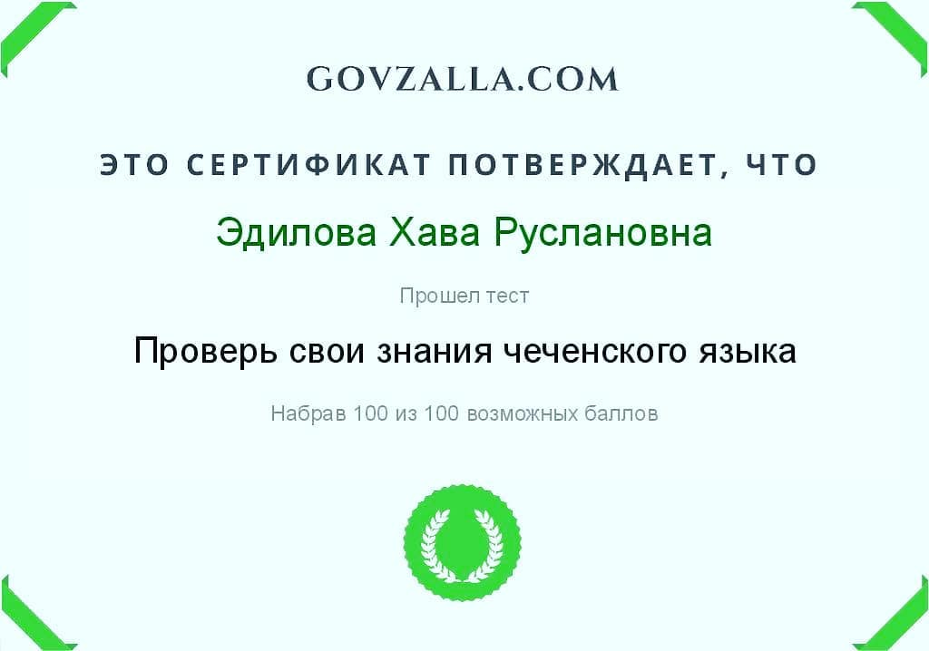 На сайте Govzalla.com Заведующий и весь коллектив МБДОУ "Детский сад "Тамара" с.Пролетарское Грозненского муниципального района прошли тест и получили сертификаты на знание чеченского языка!