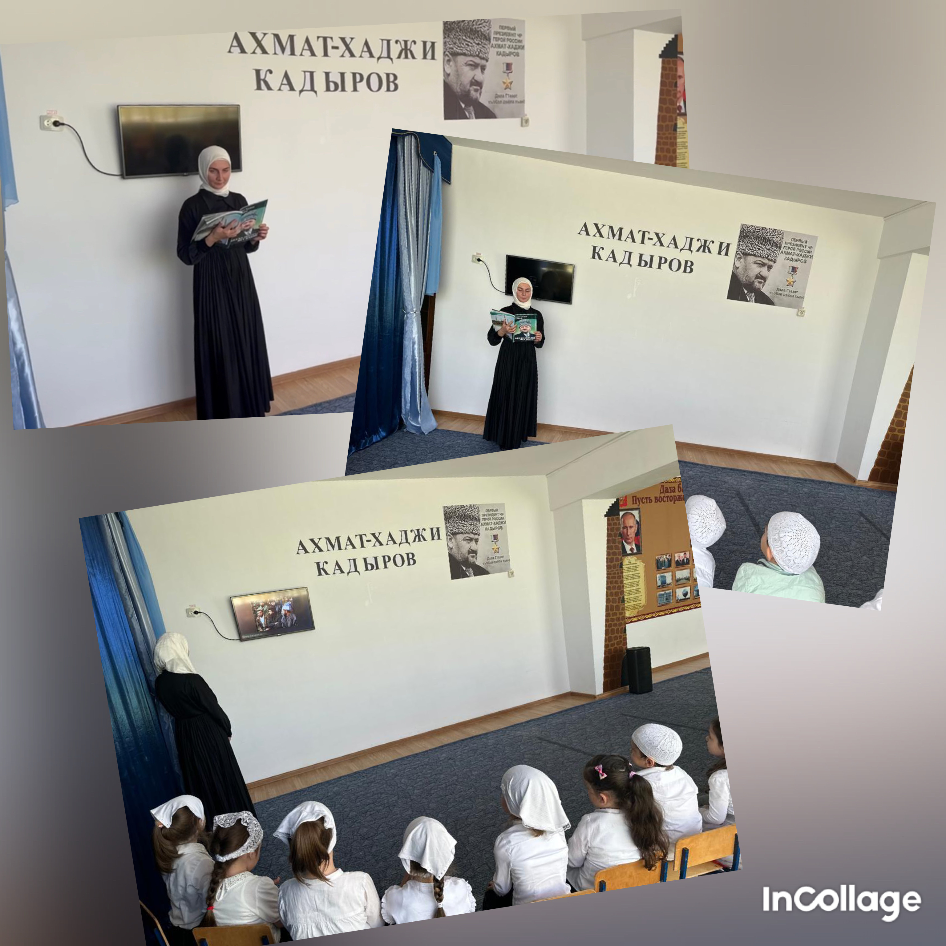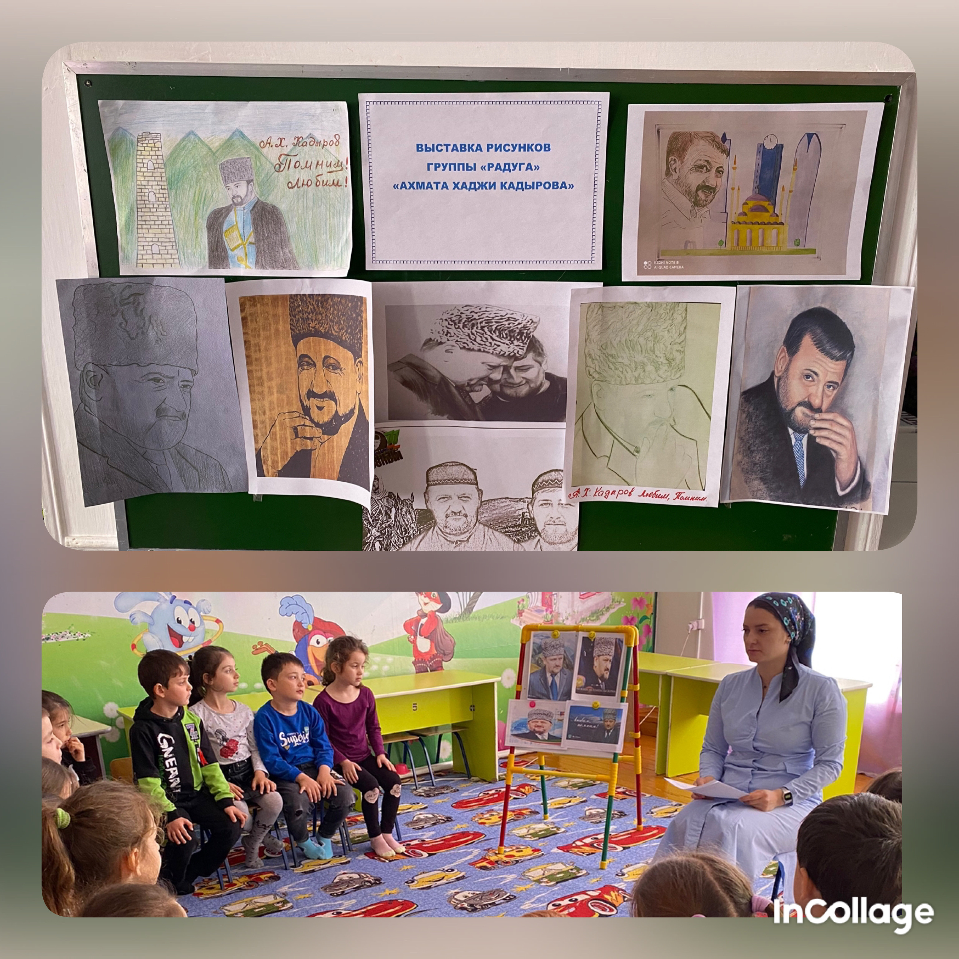 Фасад здания был оформлен тематическим баннером «Любим, помним и ценим…». В ДОУ в старших группах проведены беседы: «День памяти и скорби».Детям был показан видеорлик о жизни и трудовой деятельности Первого президента А.-Х. Кадырова. В старших группах прошла выставка рисунков «Ахмат Хаджи Кадыров - Герой нашего времени». В День памяти и скорби народов Чеченской Республики – 10 мая необходимо отдать дань уважения и памяти Ахмат-Хаджи Кадырову, выразив ему человеческую признательность. Дала г1азот къобал дойла цуьна! Он много значил для всего чеченского народа. Являлся символом Мира и Процветания нашей республики, олицетворением надежды на лучшее будущее. Он всегда говорил, что гордится своим народом. Народ отвечал ему взаимностью. Мы гордились при жизни А.А. Кадыровым, гордимся им и после его смерти. Он ушел непобежденным! Ахмат-Хаджи Кадыров был в высшей степени мужественным человеком, так как в самые тяжелые и опасные времена для чеченского народа стал во главе нации и вывел нас из царства хаоса.