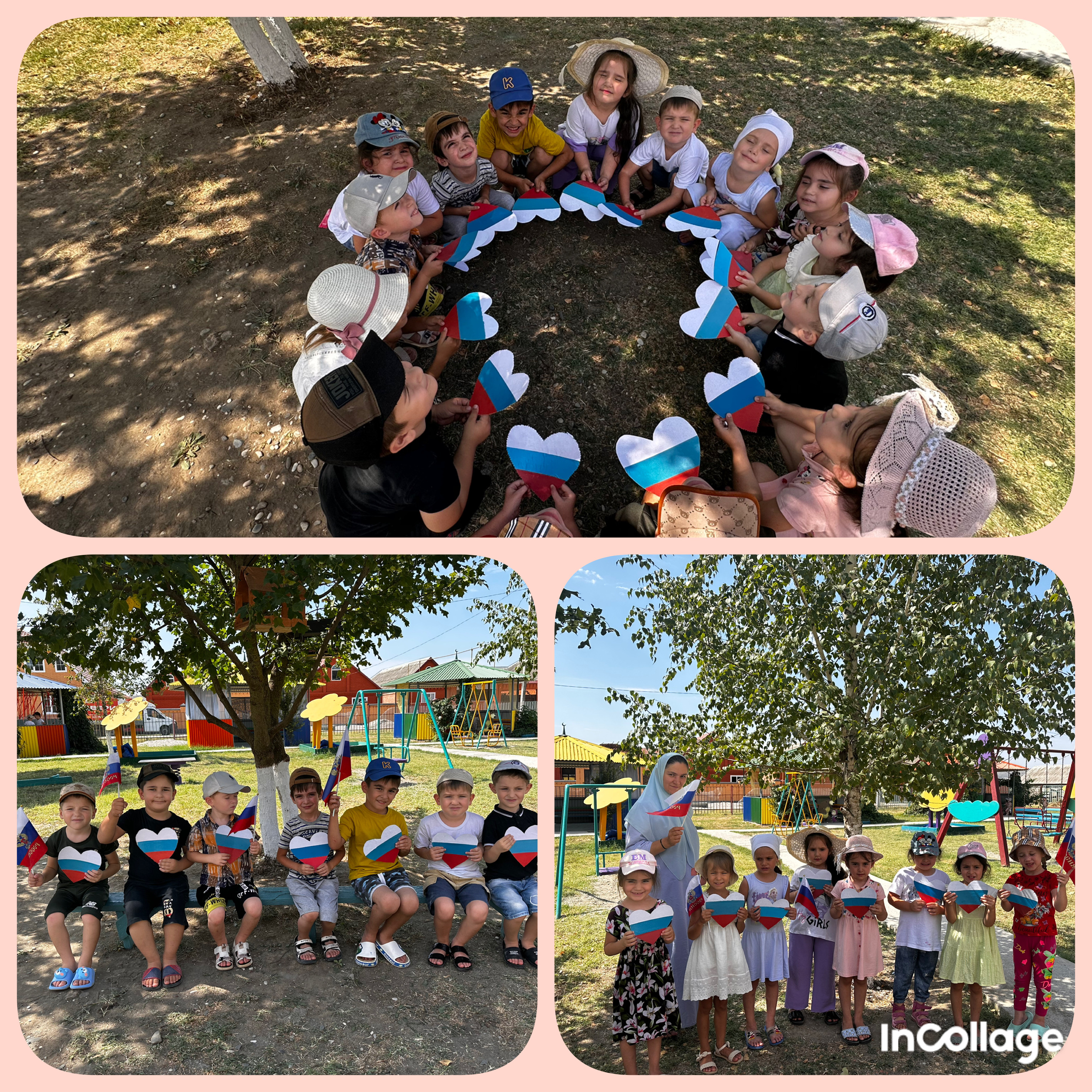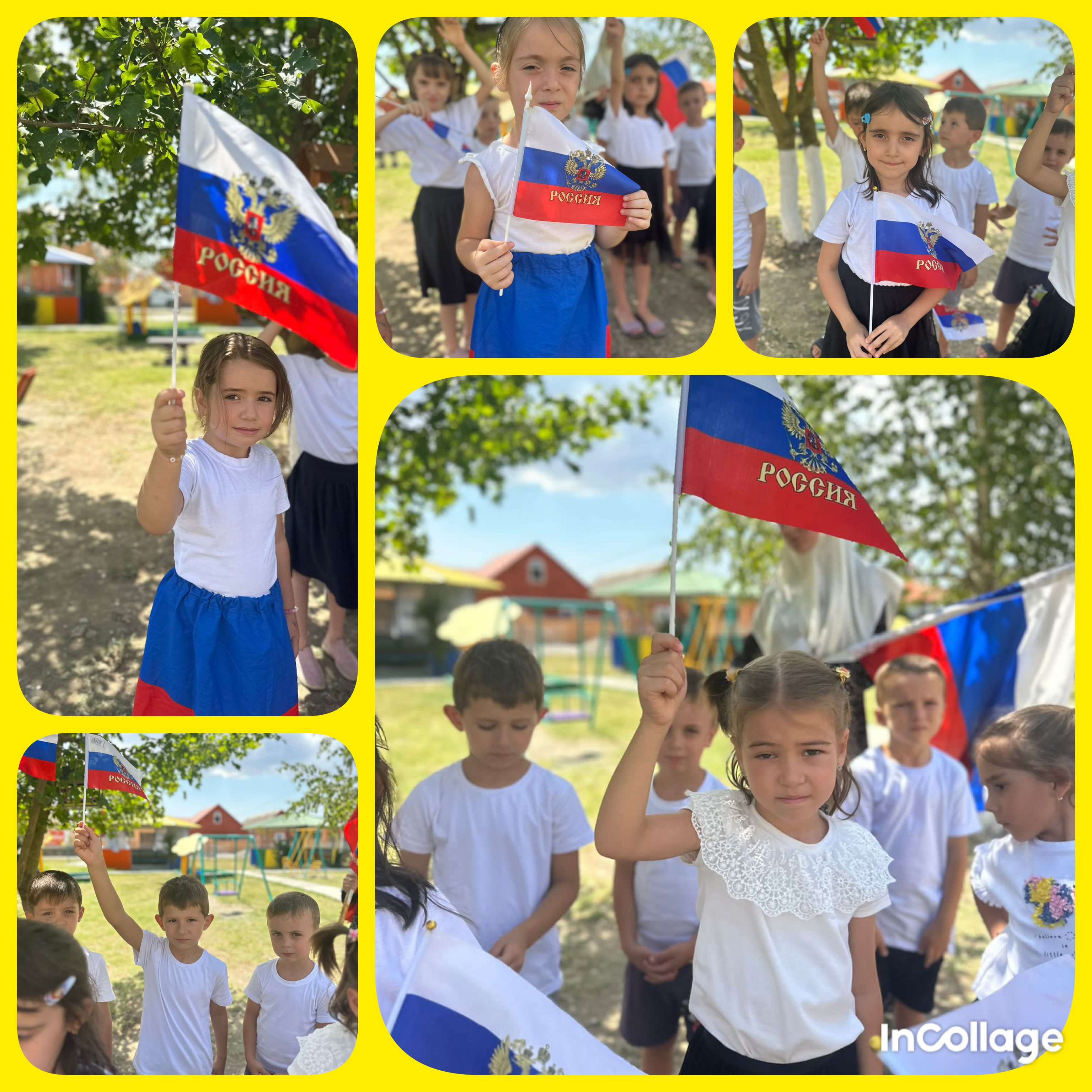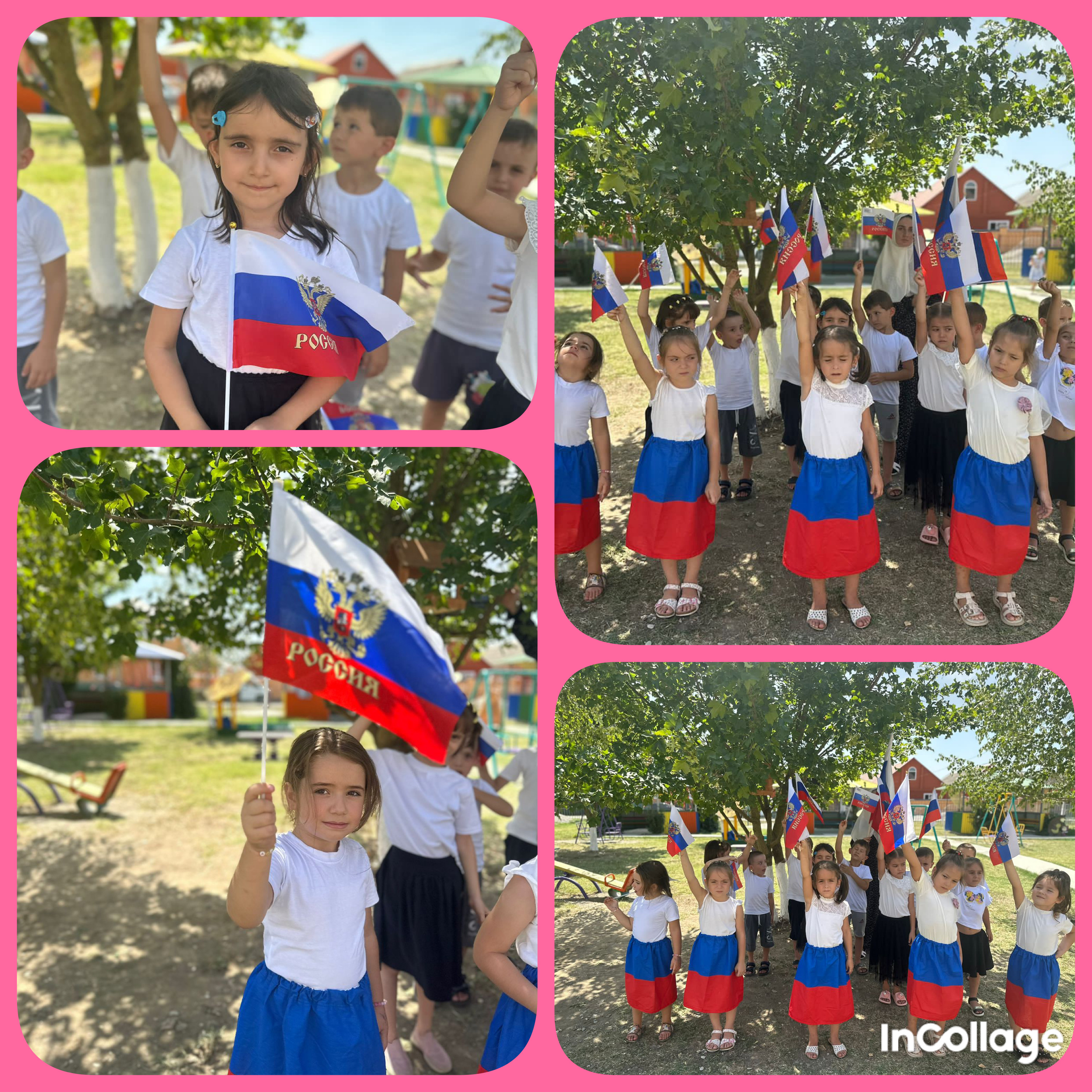 Во всех группах были проведены беседы с детьми о государственной символике, рассматривание Российского флага, чтение стихов о России, разучивание песен, танцев. Дети внимательно рассмотрели флаг, узнали, что обозначает каждая полоска, были организованы такие подвижные игры, как: "Передай флажок", "Пронеси флаг сквозь преграды", "Кто быстрее принесет флаг?" и др. Финалом развлечения стало коллективная аппликация. Все аппликации получились очень яркими и интересными и соответствовали тематике праздника. В завершении мероприятий посвященных празднованию Дня Флага РФ воспитанники подготовительной группы «Цыплята» подготовили танец «День Флага».