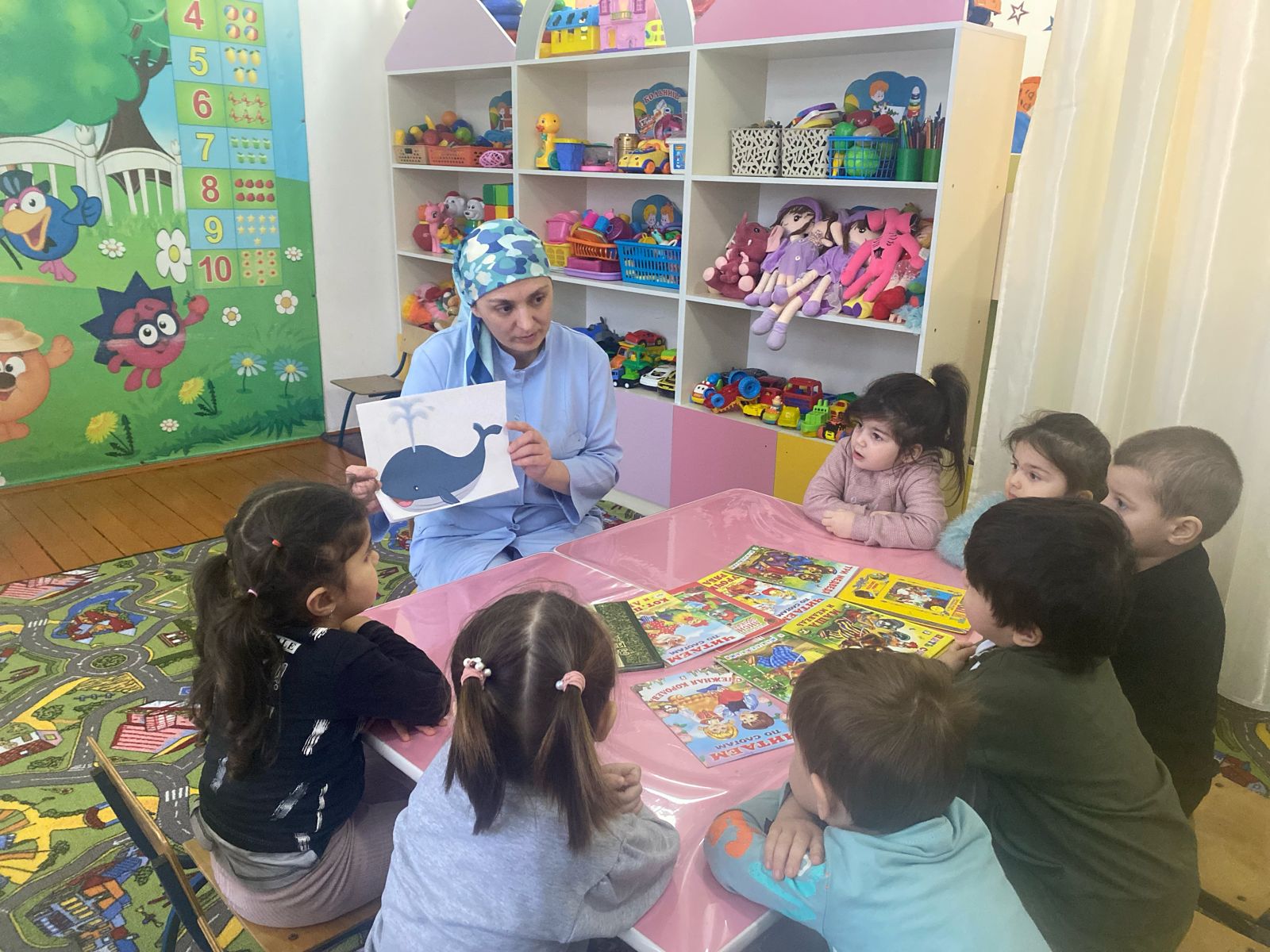Накануне празднования «Дня китов» были проведены мероприятия по изучению этих живых существ и причин, по которым грозит им смертельная опасность. Велись экологические беседы, ребята смотрели презентации на морскую тематику,читали художественные произведения о морских млекопитающих, лепили из пластилина морских обитателей. Воспитанники детского сада познакомились с многими обитателями морских просторов.